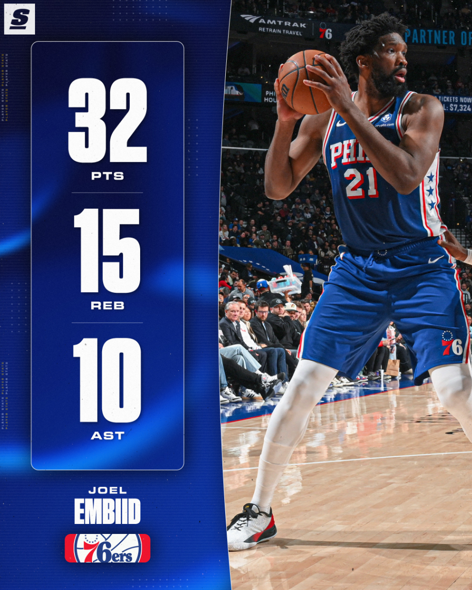 恩比德鏖战45分36秒赛季新高,拿到32分15篮板10助攻1抢断1盖帽5失误,命中率52.6%,三分命中率33.3%,罚球12中11。