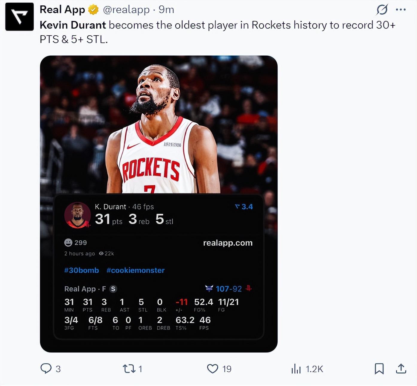 杜兰特此役三节打卡31分钟,21中11,三分4中3,罚球8中6,拿到31分3篮板1助攻5抢断,命中率52.4%,三分命中率75%,杜兰特成为火箭队队史年龄最大的30+5抢断先生。