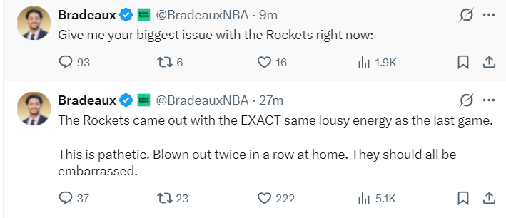 这场比赛让火箭记者Bradeaux非常不满,他在赛后写道:请火箭球迷们评论一下这场比赛你们最不满的地方?(评论区很多人在炮轰申京、阿门,也有人指责乌度卡,更多的是对积极性、防守不满)
