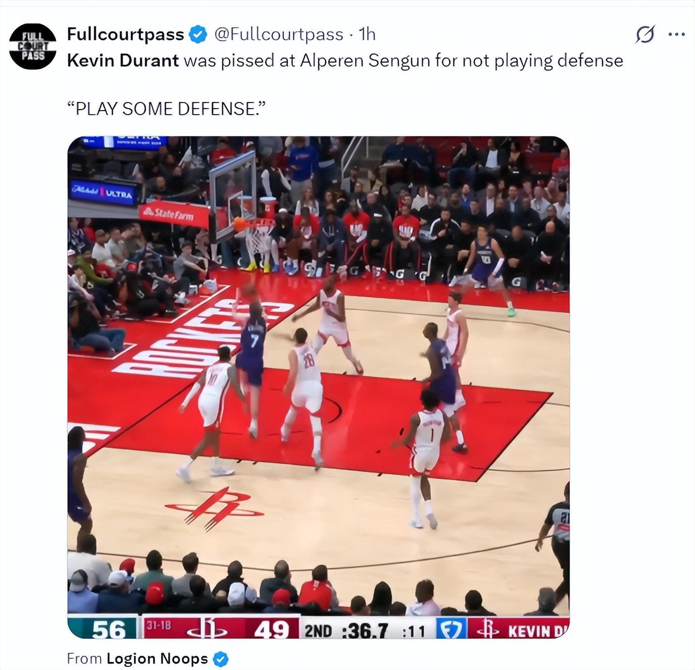 这场比赛的第二节,克努佩尔持球突破,申京被一步过,杜兰特就对申京的防守非常不满,KD怒吼:我的天啊,拜托你还是防一次吧!