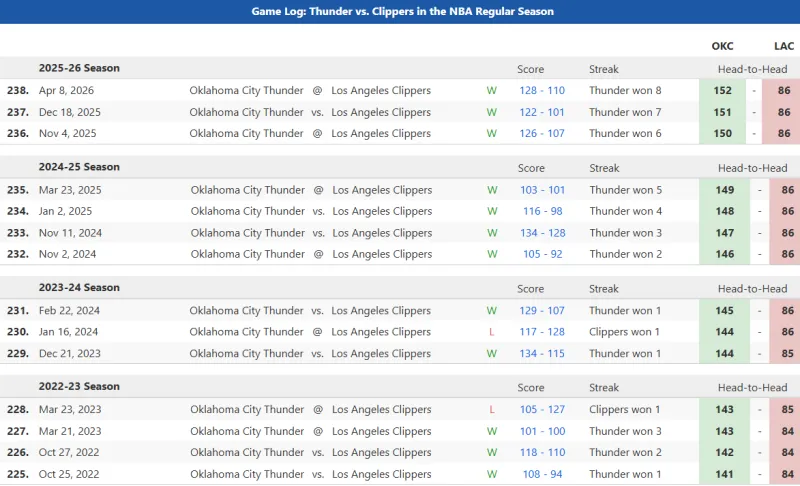 过去四个赛季,雷霆面对快船拿到12胜2负。